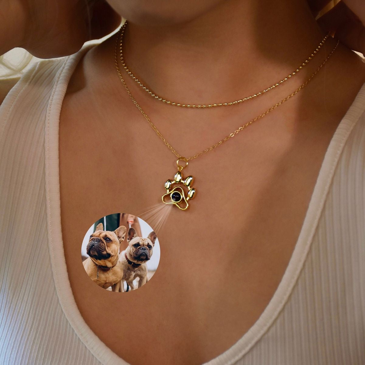 Lleva a tu compañero fiel cerquita del corazón con este collar de huellita con proyector, capaz de mostrar la foto de tu mascota con solo acercarlo a la luz o la cámara del celular.