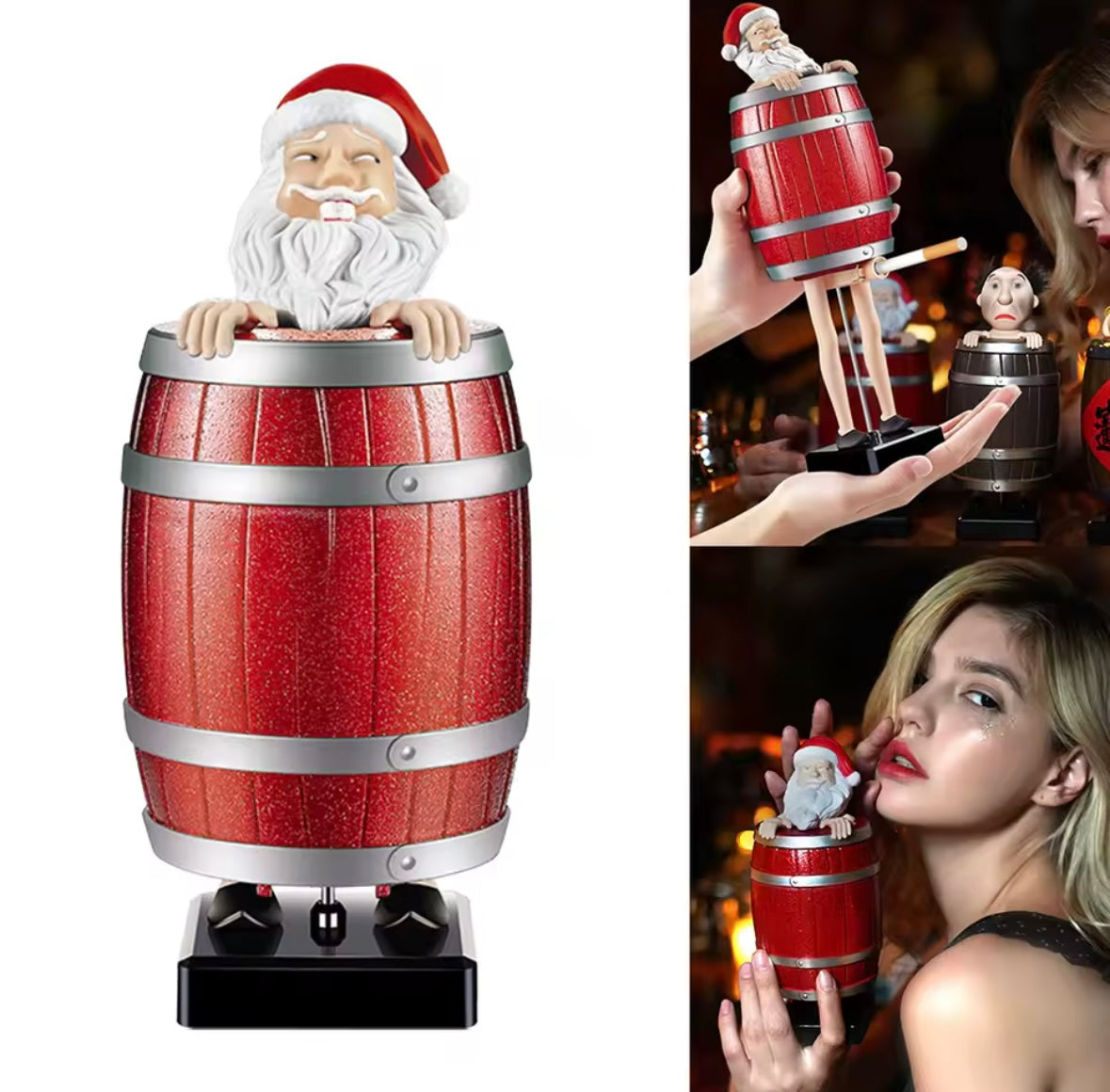 Este Santa “escondido” en un barril sorprende a todos al levantar la parte superior. Es liviano, llamativo y perfecto para usar en fiestas, reuniones o como regalo gracioso para un fumador con estilo.